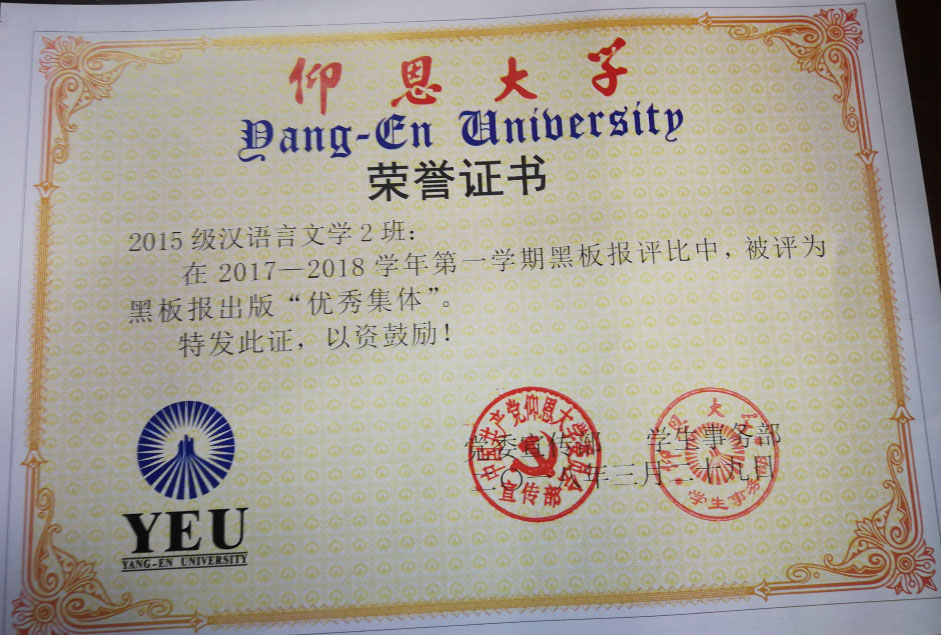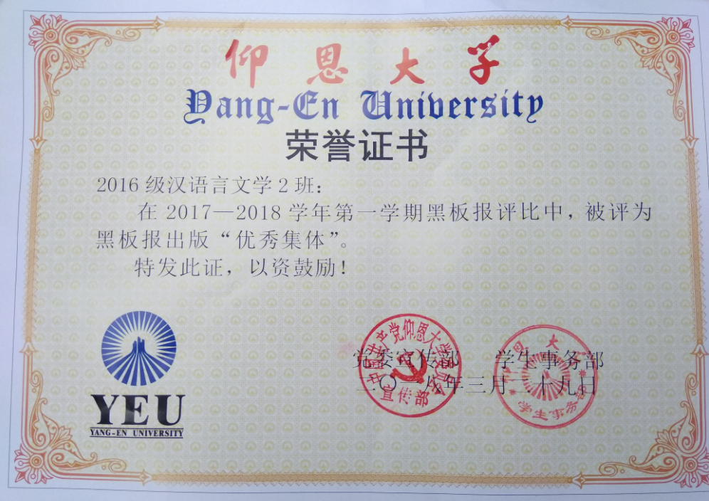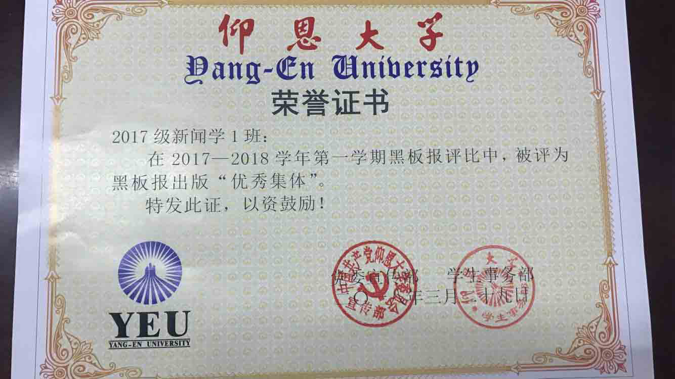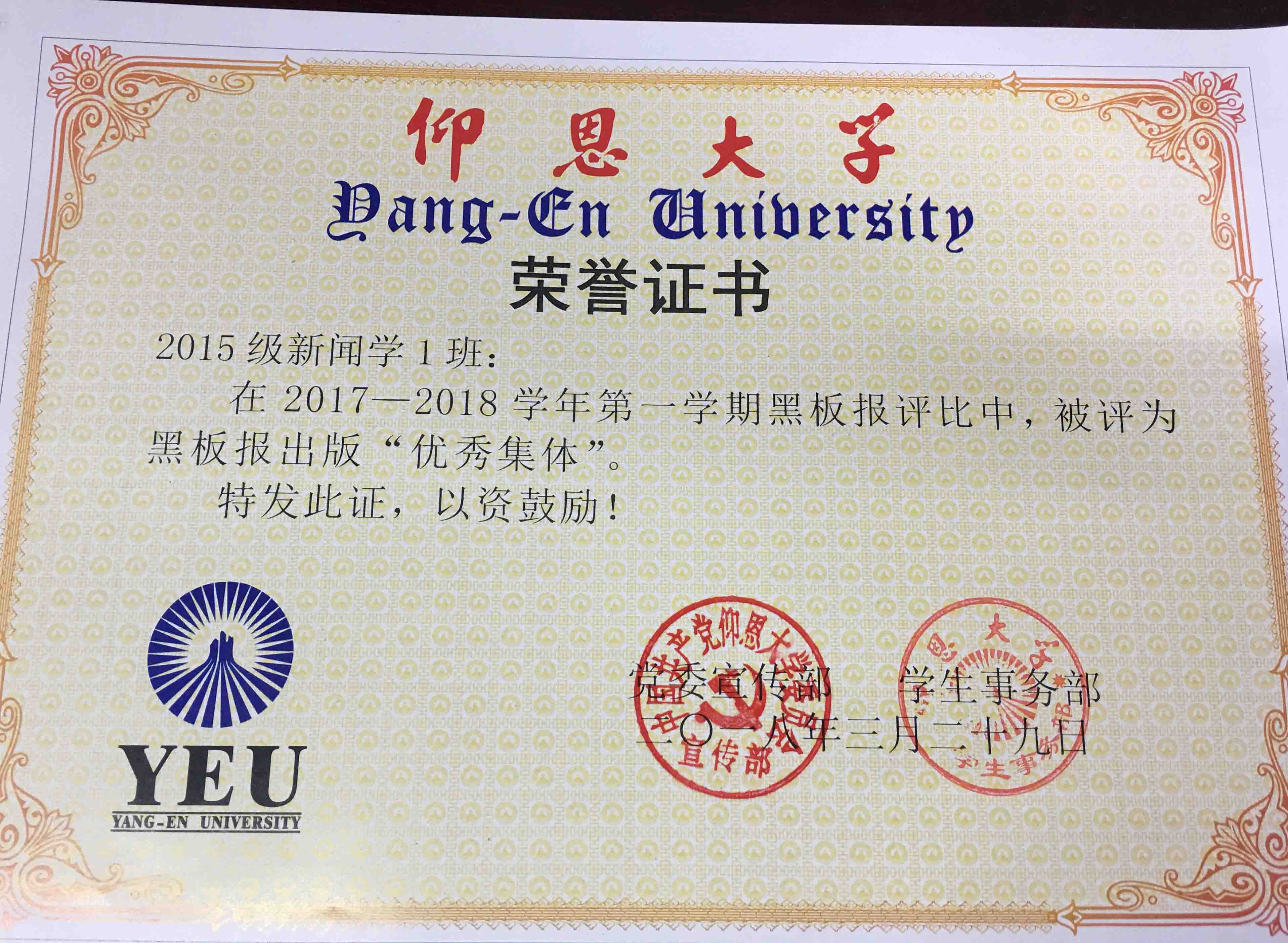 在2017—2018学年第一期黑板报评比中,奥门新浦京官网有5个班级被评为黑板报出版“优秀集体”,他们分别是15新闻学1班、15汉语言文学2班、16汉语言文学1班、16汉语言文学2班、17新闻学1班、17新闻学2班、17广告学1班。