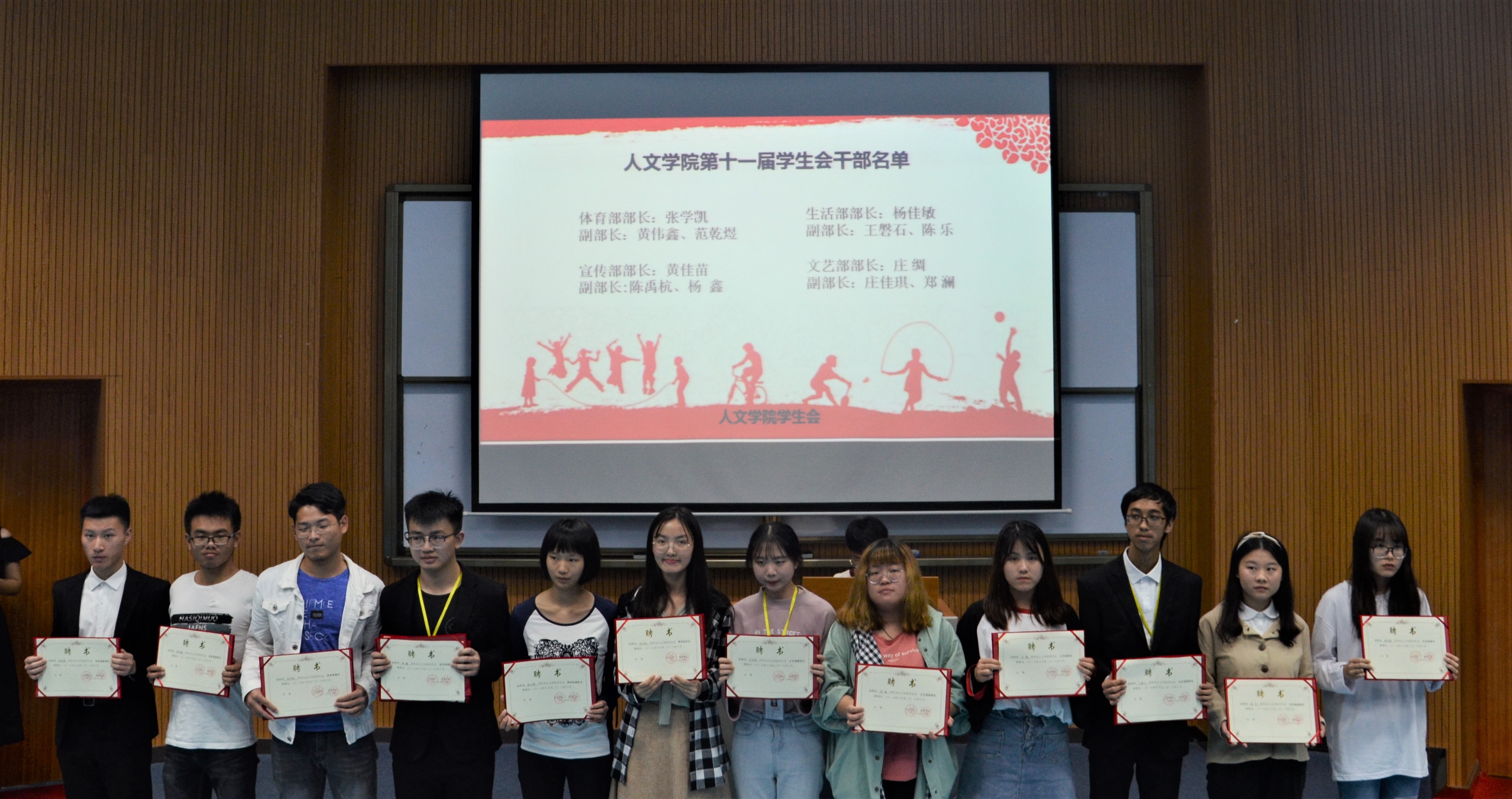 运动员代表冯钰银发言 林奇鹏、吕淑滟、黄佳苗等数名干部荣获奥门新浦京官网学生会2016-2017学年先进个人称号;体育部及生活部荣获“学生会2017-2018学年优秀部门”称号,老师们为优秀个人和集体颁发奖状,并为第十一届全体学生会干部颁发聘书。