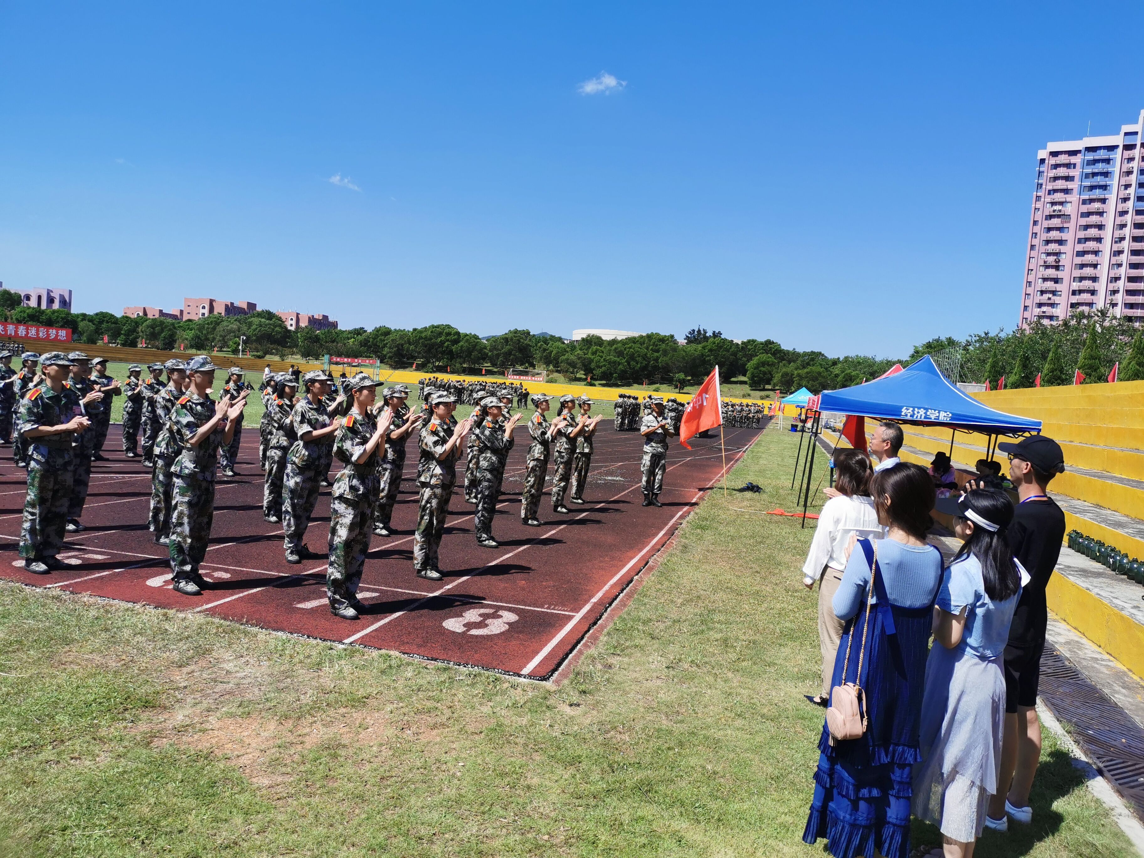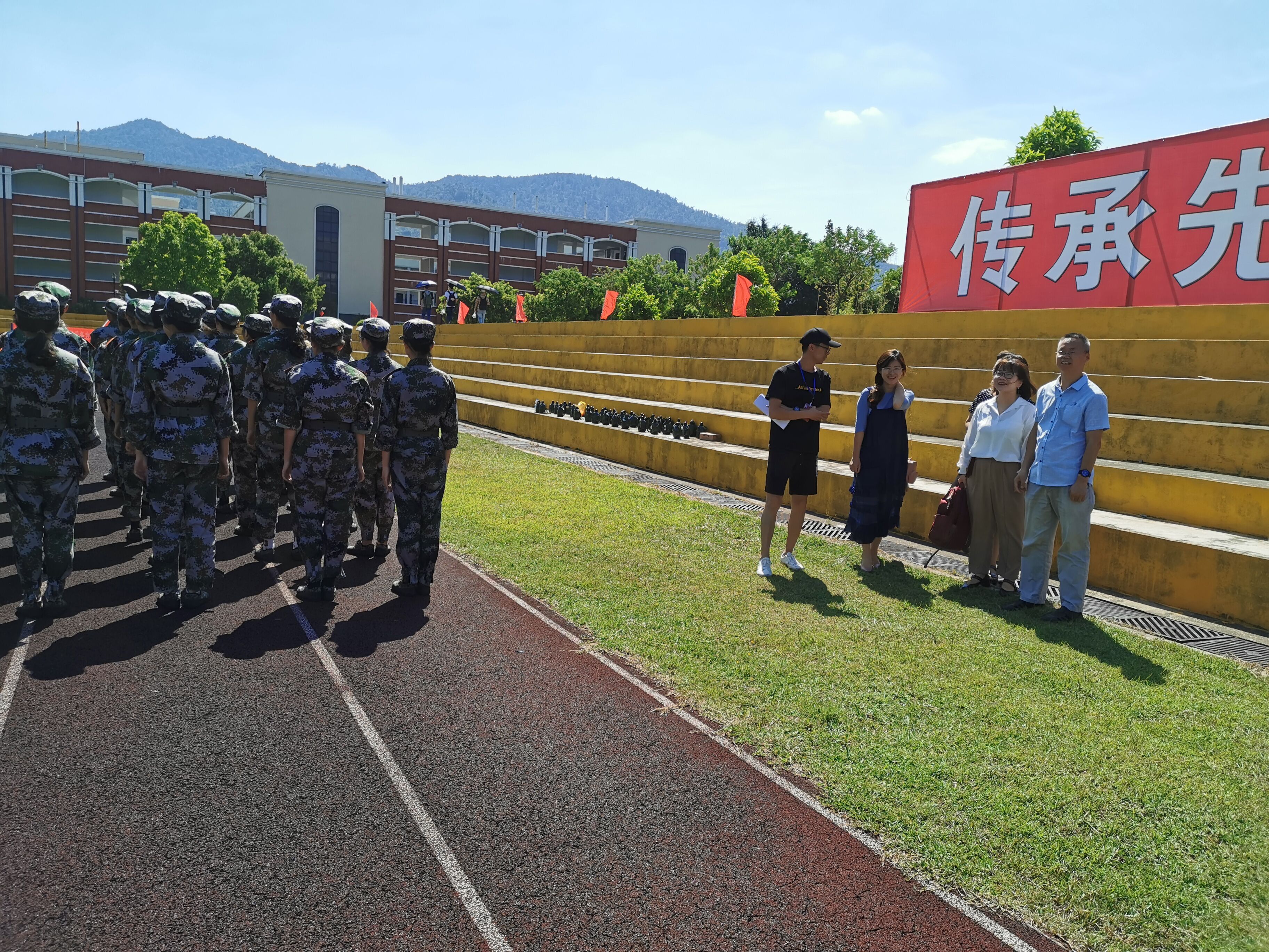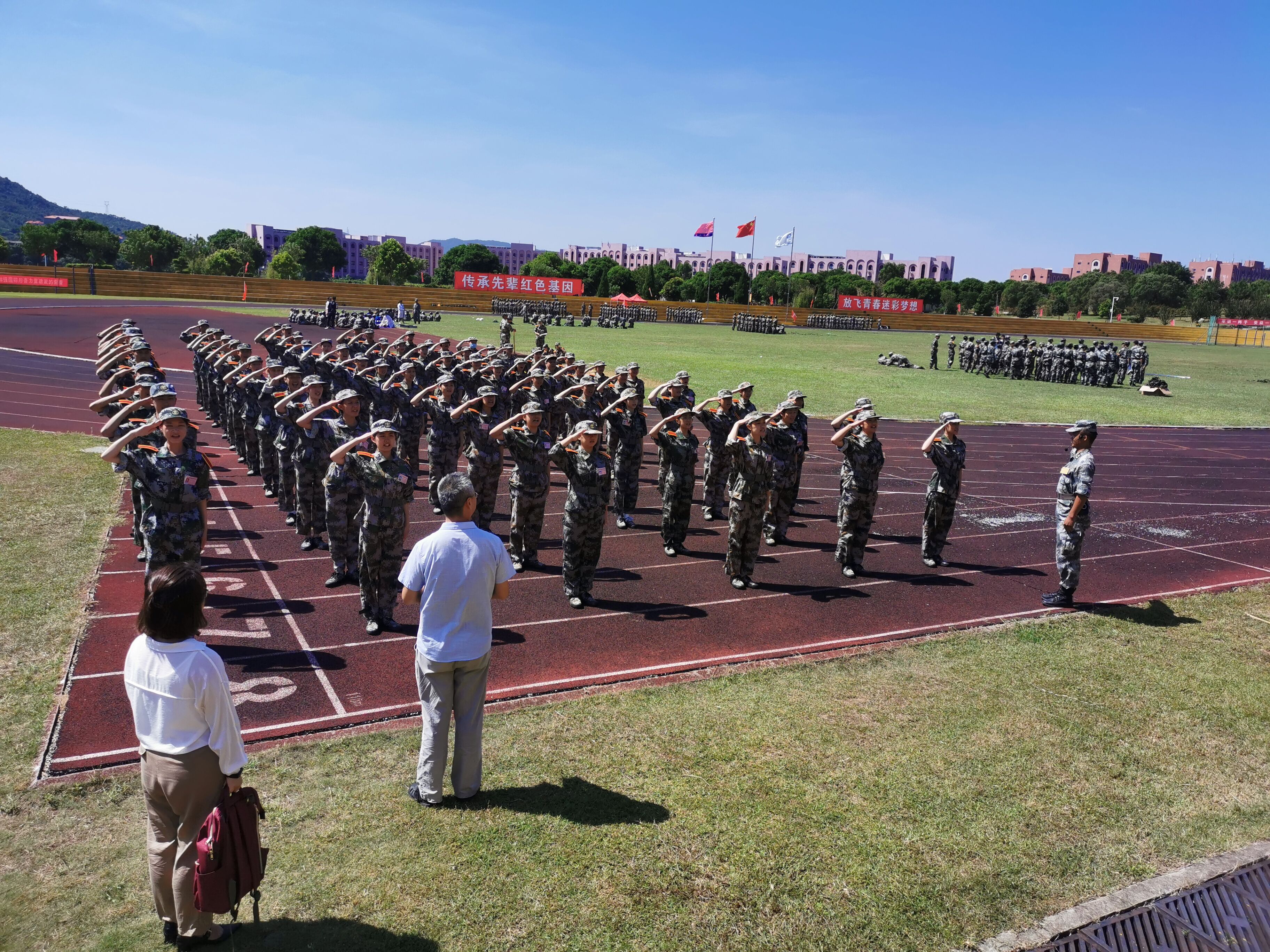 胡友仁书记对教官们的辛苦训练和指导表示感谢,嘱咐新生们要能吃苦,听从指挥,服从命令,以优异的成绩完成大学的第一课。