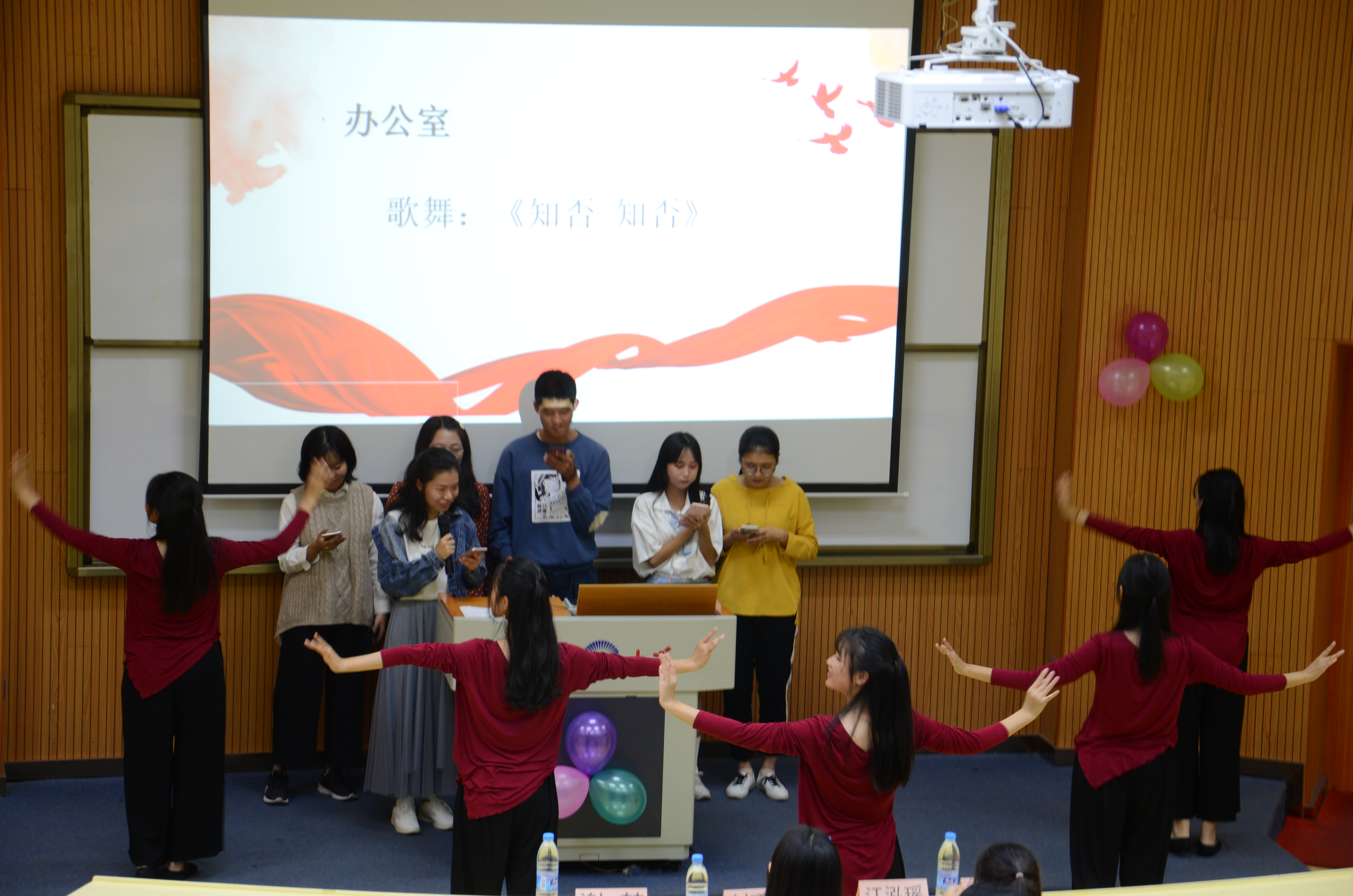 游戏环节 “夸张的肢体动作,妙趣横生的描述性语言,”期间穿插的“你说我猜”游戏环节更是激起全场的阵阵雷动的笑声和掌声,刘巧玫老师也和学生组队参与其中。游戏结束之余,组织部以一首舒缓绵长的吉他弹唱《奇妙能力歌》扣动心弦,拉进新老成员间的距离。紧随其后的办公室,以热门古风单曲《知否 知否》串联起一段柔美舞蹈,现场掌声不断。最后,纪检部成员独唱一曲《勾指起誓》,以稳健的台风和稳定的音准打破次元壁,全场不禁跟随节奏为她“打call”。
