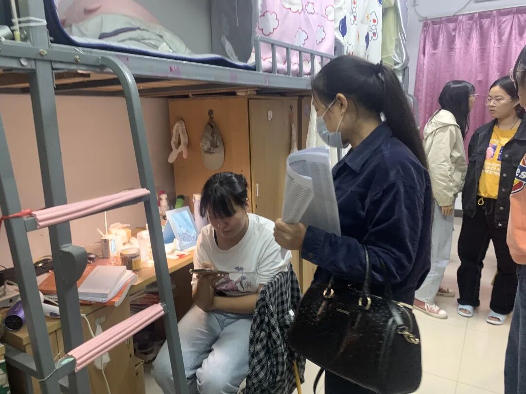 岳秀文老师及全体辅导员深入各个宿舍进行大功率电器的突击检查,并进行安全知识的宣传,提高同学们宿舍的安全意识。此次检查,重点检查了学生宿舍是否有使用违规大功率电器和寝室中是否有乱接电线违规现象,且在现场对电器安全隐患问题,进行了详细的落实,并提出整改意见。在检查过程中,岳秀文老师及辅导员们和学生展开进行亲切交流,认真询问学生学习、生活情况,关注学生身体状况与心理变化,做好学生思想工作,叮嘱同学们在学校要学会照顾好自己,同时从谈话中了解了恢复线下教学以来所面对的问题。面对大一新生对于新环境的适应和高年级学生目前的职业规划情况,老师们分别与其深入进行交谈,提出相对应的建议,努力解决学生的困惑,使同学们能够更好地迎接和面对接下来的学习生活。