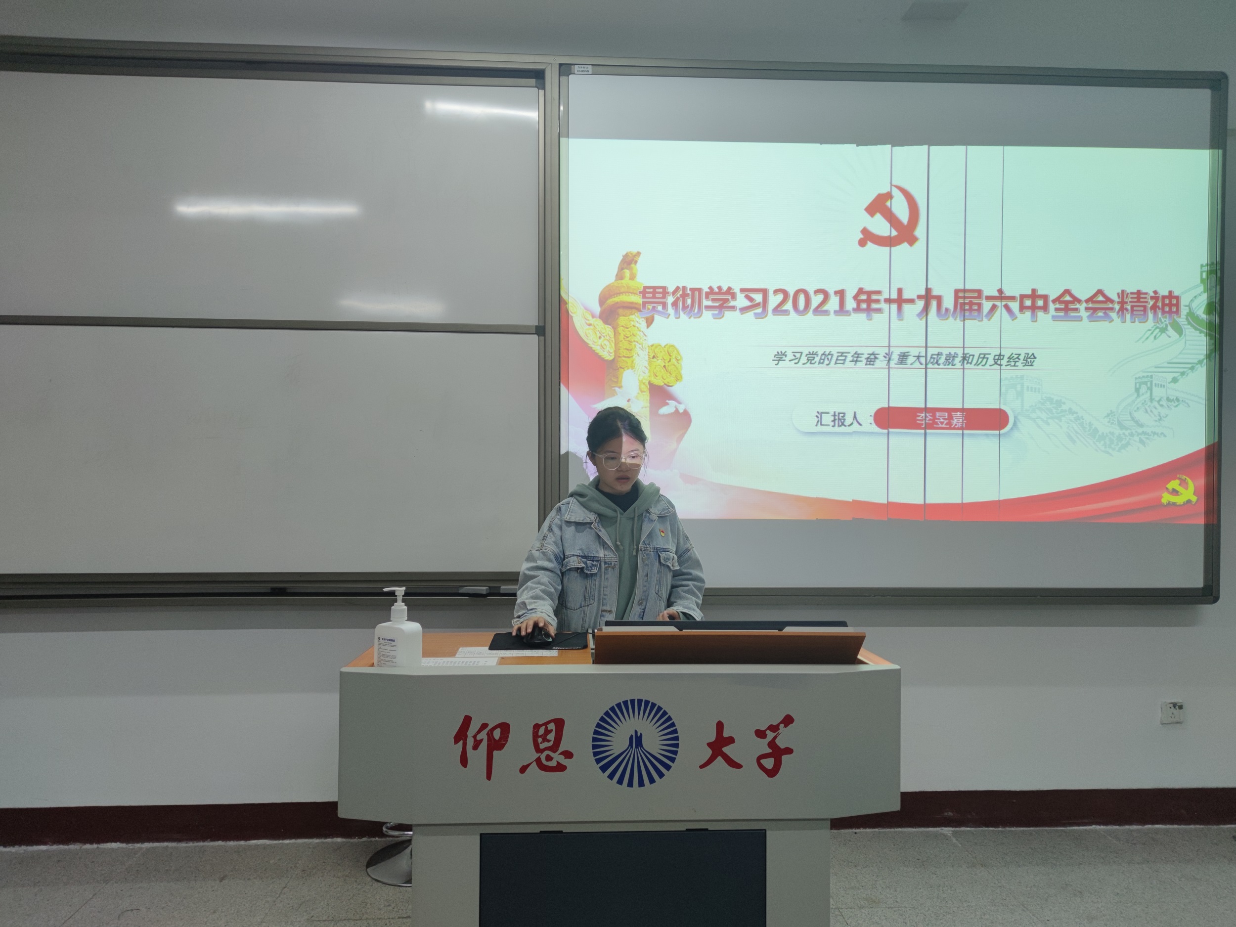 为将学习贯彻党的十九届六中全会精神持续推向深入,11月23日晚上,奥门新浦京官网专升本学生党支部于仰恩楼C1-307开展“十九届六中全会精神”学习分享活动。