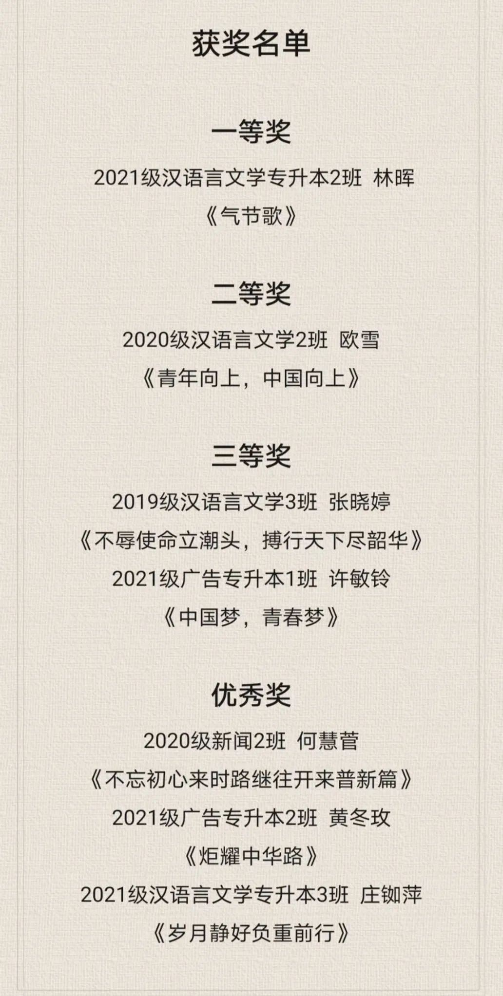 获奖名单 在作品中,参赛者们满怀铿锵的热血,用文字谱写华丽篇章。他们正青春、正蓬勃、正奋斗,他们用自己的方式彰显时代的朝气。通过此次征文比赛,新浦京官网学子对党有了更加深入的认识,也激励他们在以后的研学生活中自觉强化思想自觉、政治自觉和行动自觉,成为担当民族复兴大任的时代新人,不负青春、不负韶华、不负时代,努力为新时代贡献青春力量。(奥门新浦京官网新媒体中心/文图)