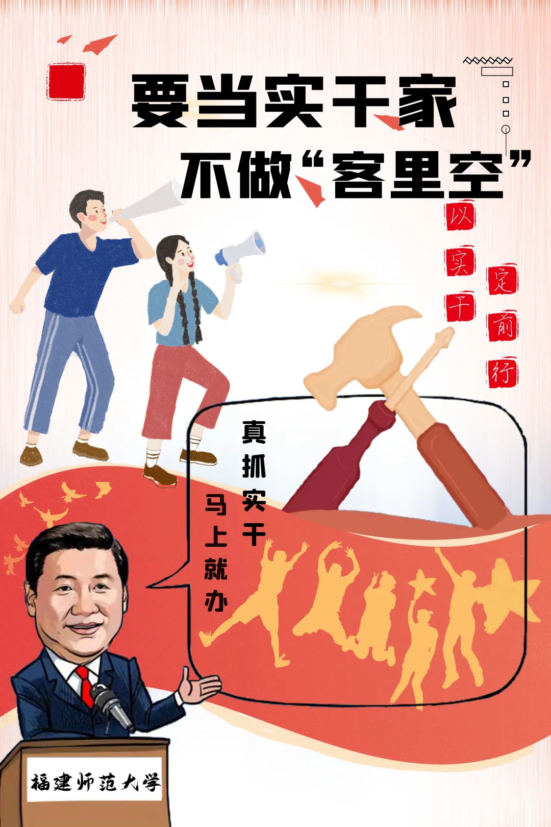 活动现场,新闻传播学系学生党支部书记王勇浜同志首先分享了自己学习《习近平与大学生朋友们》系列访谈实录的心得体会,然后其他党员同志依次上台进行分享。阮怡静、林琳欣、叶秀青同志制作的海报整体色调以红色与白色相交融为主,象征着积极向上的红色教育。背景融入的“锤头”、“螺丝刀”、“以实干,定前行”等元素,展现了爱岗敬业、任劳任怨、无私奉献、埋头实干的形象。吴梦凡、林佳雯同志在海报中加入了不同的大学生形象,表达大学生的爱国,励志,求真,力行的精神。陈钰洁、林雅雯同志制作的海报选取习近平主席与大学生一起交流的图片进行彩绘制作,展现大学生风采。陈玉莲、胡雅婷的海报融入了天安门、国旗以及军人的元素,表现了红色的革命精神和五四精神。颜宁静、李绚同志制作的海报表现了习近平总书记对西安交通大学的大学生朋友们继续传承弘扬西迁精神,不忘初心、牢记使命,不负党和人民的深切期望。吴姗姗、杨圭銮同志所制作的海报以蓝色为主色调,结合和平鸽作为海报背景,象征着当代大学生的青春与活力。