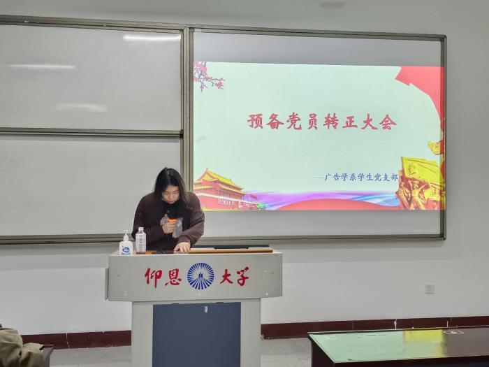 12月12日晚上7:00广告学系学生党支部在仰恩楼D1-401教室召开了接收预备党员大会暨预备党员转正大会。支部书记戴舒容同志主持本次会议。
