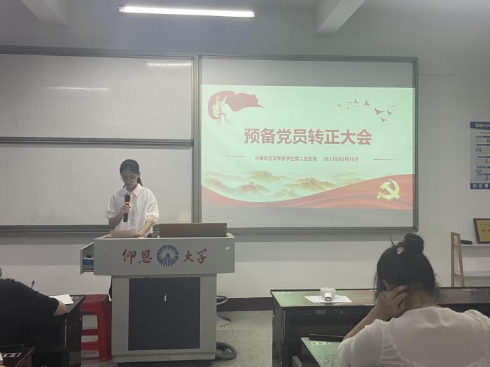 中国语言文学系学生第二党支部于6月20日晚上20:00在仰恩楼B1-201召开预备党员转正大会,支部全体党员及预备党员参加了本次会议。