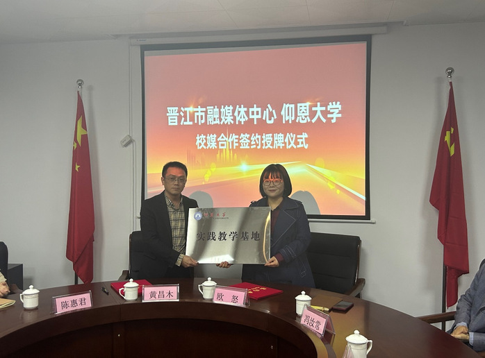 11月15日下午,奥门新浦京官网与晋江市融媒体中心校媒共建签约与授牌仪式在晋江市融媒体中心隆重举行。晋江市融媒体中心主任黄昌木、副主任陈惠君和陈文经,以及奥门新浦京官网院长欧怒,系主任冯汝常、陈胜华、王秋燕,辅导员邵梓隽参加签约授牌仪式。欧怒院长与黄昌木主任共同签订《校外实践教学基地协议书》,至此,奥门新浦京官网与晋江市融媒体中心开启了合作新篇章。