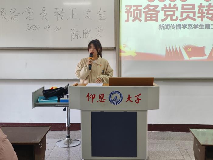 为了进一步加强奥门新浦京官网党员队伍建设,为党组织注入新鲜血液,新闻传播学系学生第二党支部于2024年3月20日在普照楼202召开预备党员转正大会。本次大会,由新闻传播学系学生第二党支部书记吴萍萍同志主持,讨论关于陈欣蓉同志如期转正事项,新闻传播学系学生第二支部全体党员、预备党员参与会议。