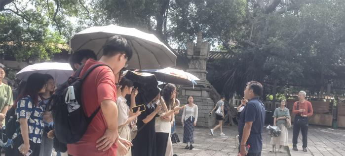首先,同学们和泉州历史文化中心的平一老师一起参观了开元寺。平一老师向同学们分别介绍了开元寺“紫云”与对联的由来,东西塔的历史渊源和大雄宝殿的文化底蕴等,旨在帮助同学们开发创造性思维,为之后的文创设计积累专业实践案例。