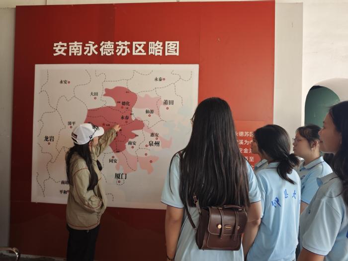 跟着讲解员的脚步进入旧址,首先映入眼帘的是一幅巨大的油画,画中地下党员慷慨激昂地演讲,生动再现了当年发动群众参加革命斗争的壮丽场景。将视角转换到边墙上,这面墙上展示了安南永德苏区的红色区域。旁边的陈列馆中记载着在这片区域发生的革命历史,让实践队员们更好地了解了红色革命精神。