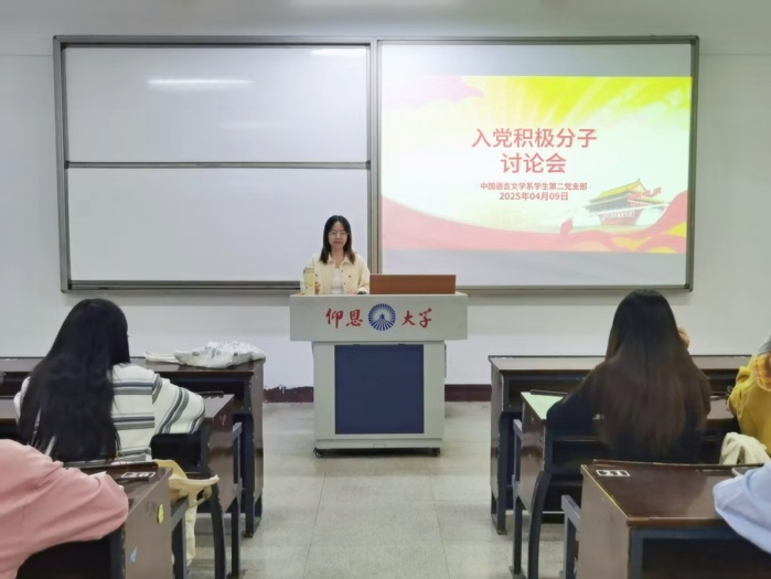 为进一步提升入党积极分子的思想政治素养,增强理论结合实践的能力,中国语言文学系学生第二党支部于2025年4月9日晚在仰恩楼A1-111教室召开第52期入党积极分子讨论会。支部书记谢云主持本次会议。