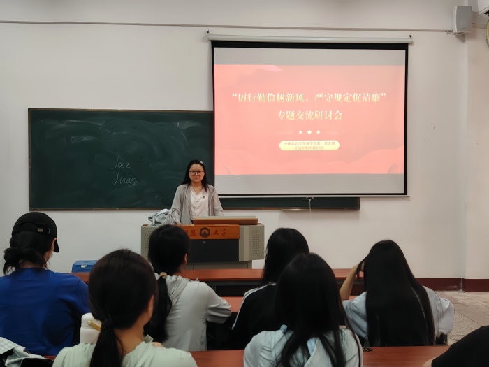 2025年5月23日下午,中国语言文学系学生第一党支部于祥贤楼203召开以“厉行勤俭树新风,严守规定促清廉” 为专题的交流研讨会,本次活动旨在深入贯彻中央八项规定精神学习教育,弘扬勤俭节约传统美德。支部书记赵潇潇出席此次会议。