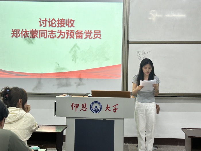 大会主要围绕在讨论是否接收陆薪羽、宋慧灵、吴怡真、郑依蒙四位同志为中共预备党员的问题。在预备党员接收大会上,四位发展对象依次宣读了入党志愿书,表明了自己的入党动机和对党的认识,汇报了自己在现实生活中的个人表现,并且表示日后会以党员的标准严格要求自我,向党组织靠拢。经过入党介绍人和到会同志的讨论,根据不记名投票,支部一致同意接收陆薪羽等四位同志为中共预备党员。随后,被接收的四名预备党员依次进行表态。她们表示感谢党组织给予的信任,在未来的生活里,她们将以党员标准严格要求自己,秉持优良品德,积极改正不足,时刻做好准备接受党组织的考验。