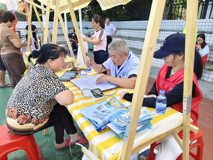 活动由多部门协同开展,队内成员身着醒目服装在现场参与,且分工明确。队员们不仅积极地在民俗文化园备消暑饮品,及时补足后勤物资,还亲自参与体验棉花糖制作,协助医护人员量血压、记数据,结合建议讲保健知识。同时,队员们还借问答游戏、道具演示等为居民们普及垃圾分类等生活常识。