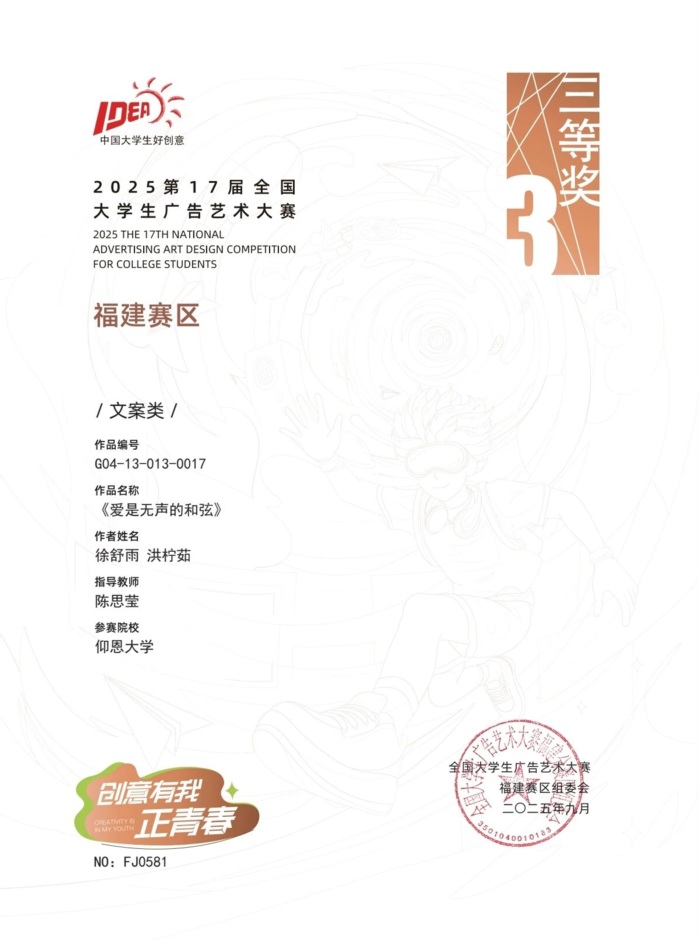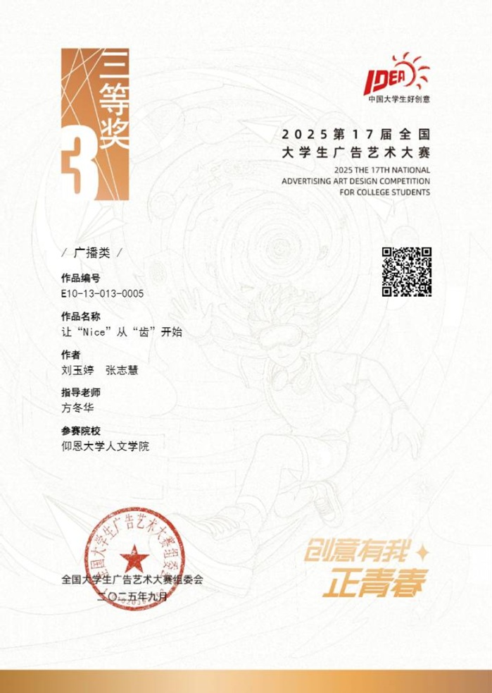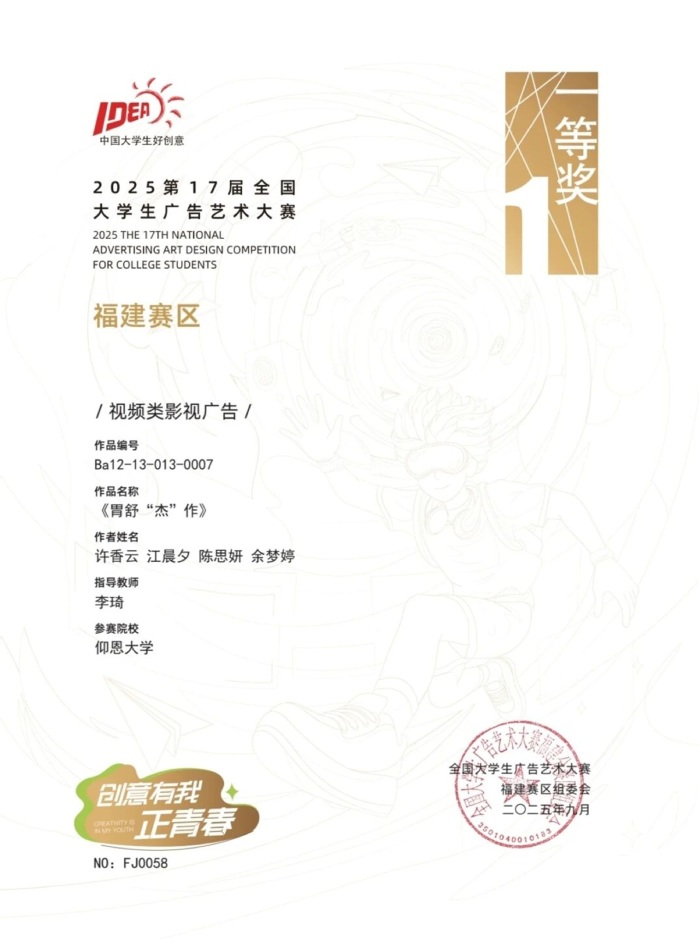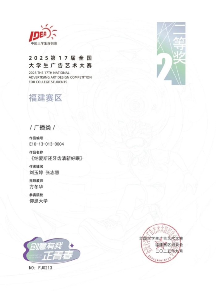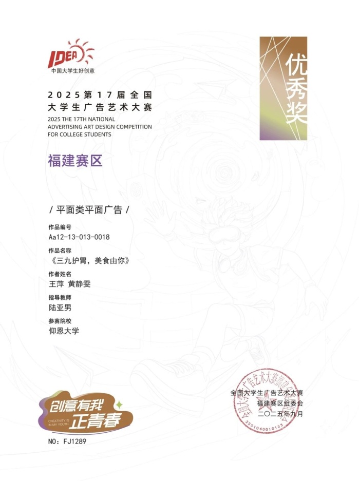 本届大赛中,新浦京官网参赛作品涵盖了平面设计、影视、动画、广播、文案、策划案等多个类别,充分体现了新浦京官网学生在广告创意、设计表达等方面的综合素养与实践能力。以下是部分获奖者证书展示: