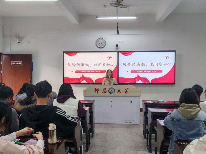 为深入推进党风廉政建设,厚植学生党员廉洁修身的思想根基,中国语言文学系学生第二党支部联合普照书院于12月24日下午在仰恩楼A1-109开展“风铃传廉韵,指间塑初心”主题党日活动。支部书记谢云主持本次活动。